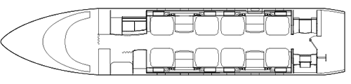 The standard double-club seating layout provides complete comfort and practicality. With a table at each seat grouping, there is ample room for taking care of the work at hand or relaxing over a quiet meal.