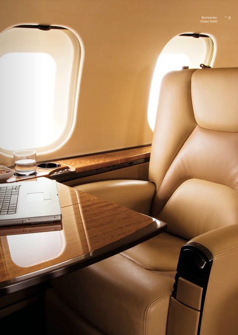 Interior Highlights 客艙要點 The sophisticated cabin of the Bombardier Global 5000 aircraft (龐巴迪環(huán)球5000公務機) provides passengers with more high-comfort living and working area than any other super-large business jet. Its quiet, airy atmosphere is highly conducive to relaxed productivity. Equipped with one of the world's most advanced, most reliable Cabin Electronic Systems, the aircraft offers business travelers the same high-caliber, high-speed connectivity capabilities and office options they enjoy on the ground, plus on-demand news/weather/sports packages as well as a theatre of entertainment choices.