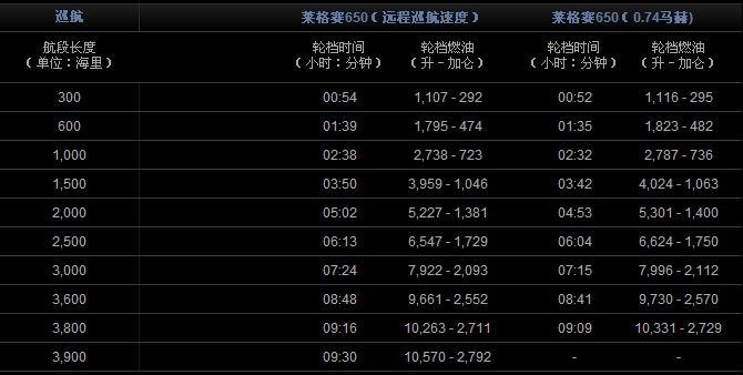 輪擋時(shí)間及輪擋燃油 4名乘客,2名駕駛員,每人以200磅(91公斤)計(jì),國(guó)際標(biāo)準(zhǔn)大氣,無(wú)風(fēng),符合NBAA IFR規(guī)定的備份燃油條件。(200海里備降距離)。起飛條件:海平面、國(guó)際標(biāo)準(zhǔn)大氣、最佳起飛重量 最大使用速度