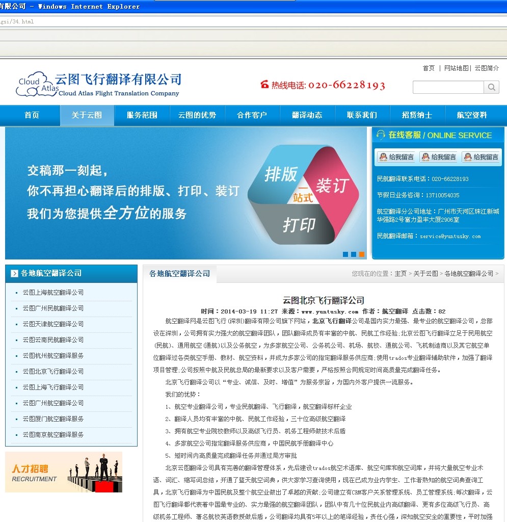 在1年多以前,曾經(jīng)發(fā)現(xiàn)一個叫“云圖飛行翻譯公司”的騙子公司,其所發(fā)表新聞里面,大量剽竊藍(lán)天飛行翻譯公司網(wǎng)頁,其中有大量藍(lán)天飛行翻譯公司的案例,騙子公司云圖飛行翻譯公司經(jīng)過仿站,將藍(lán)天飛行翻譯公司的大量網(wǎng)頁原封不動轉(zhuǎn)移過去,甚至于騙子公司云圖飛行翻譯公司的網(wǎng)站上網(wǎng)站內(nèi)容里面出現(xiàn)了藍(lán)天飛行翻譯公司的產(chǎn)品名稱: 舉例如下: ![]() ![]() 而此新聞最初是由藍(lán)天飛行翻譯公司原創(chuàng)發(fā)表: ![]() 藍(lán)天翻譯公司原創(chuàng)網(wǎng)頁截圖 上部分剽竊自藍(lán)天飛行翻譯公司介紹,下段剽竊自http://jsswgroup.cn/2011/0404/116.html如鏈接所示。 騙子公司云圖飛行翻譯公司只是將藍(lán)天換成了云圖,就連北京2個字都未做改動,其中盡然出現(xiàn)了“開通了藍(lán)天航空詞典”,這種公司,懶到就連最基本的都不改動,不說什么了,公布該公司信息如下: 騙子公司名稱:深圳云圖飛行翻譯有限公司 騙子公司電話:020-66228193 騙子公司聯(lián)系人:楊俊濤 13710054035 騙子公司電子郵件:service@yuntusky.com 騙子公司地址:廣州市天河區(qū)珠江新城華強路2號富力盈豐大廈2906室 拿著藍(lán)天飛行翻譯公司的成功案例而欺騙消費者的公司,騙子公司云圖飛行翻譯公司。
