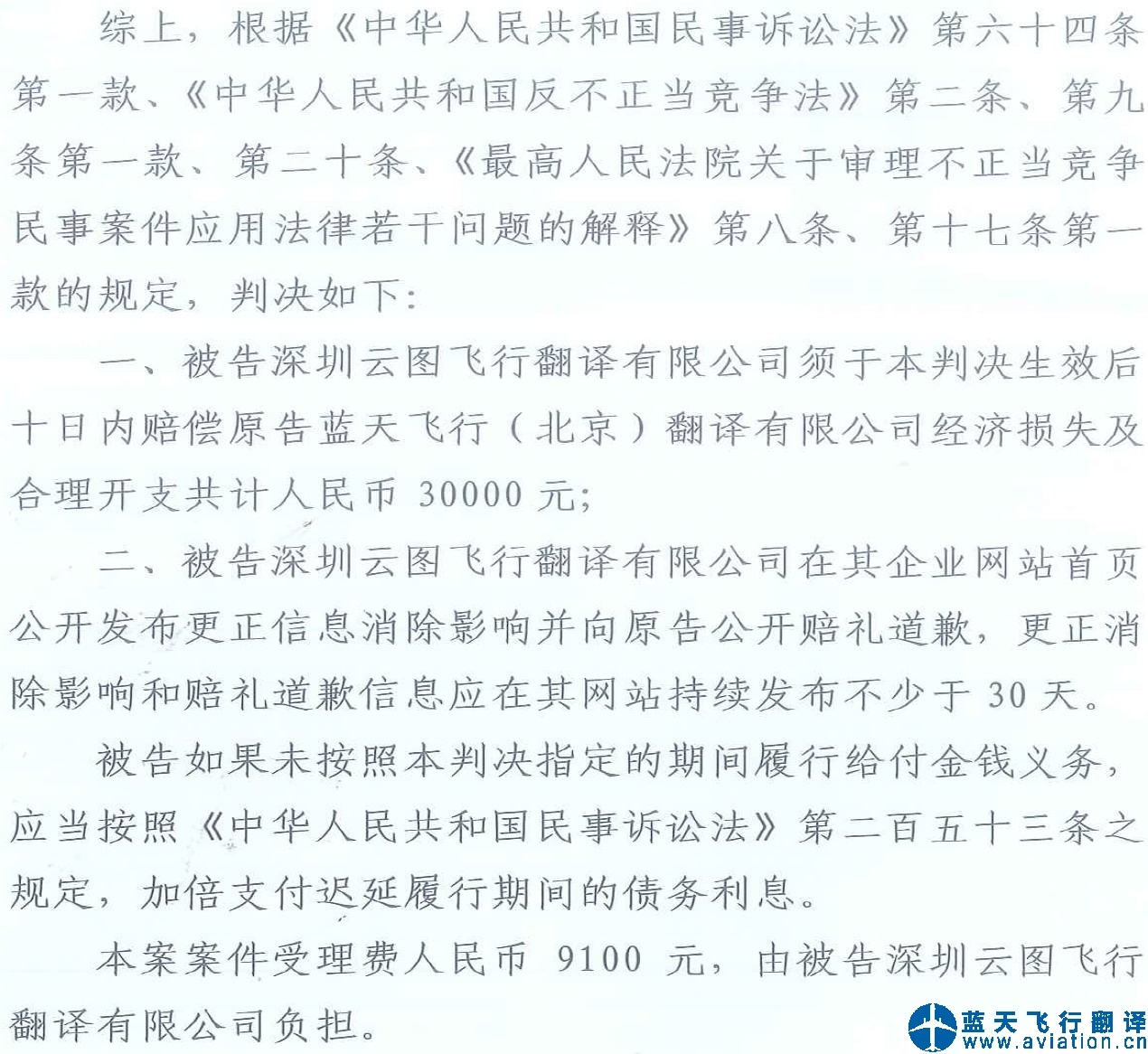 鑒于藍(lán)天飛行(北京)翻譯有限公司的原創(chuàng)網(wǎng)站網(wǎng)頁(yè)內(nèi)容被深圳云圖飛行翻譯有限公司非法剽竊,云圖翻譯公司將藍(lán)天飛行翻譯公司的大量原創(chuàng)網(wǎng)頁(yè)在未經(jīng)藍(lán)天飛行翻譯公司授權(quán)、同意轉(zhuǎn)載的情況下,剽竊、復(fù)制發(fā)布在云圖翻譯公司的網(wǎng)站內(nèi),大量網(wǎng)頁(yè)只修改藍(lán)天飛行翻譯公司名稱,以云圖飛行翻譯署名發(fā)表,如此喪盡天良的公然剽竊,云圖飛行翻譯公司虛假宣傳及不正當(dāng)競(jìng)爭(zhēng),藍(lán)天飛行(北京)翻譯有限公司已將深圳云圖飛行翻譯有限公司起訴至深圳法院。藍(lán)天飛行(北京)翻譯有限公司聲明如下: 云圖翻譯公司注冊(cè)號(hào):440307107365497 企業(yè)名稱:深圳云圖飛行翻譯有限公司 公司住所:深圳市龍崗區(qū)龍城街道中心城龍翔大道9002號(hào)志聯(lián)佳大廈5樓5560; 公司法定代表人:楊俊濤; 手機(jī)號(hào):13710054035; 成立日期: 2013年5月28日,一個(gè)去年才成立的公司,不到一年時(shí)間,為了在短期內(nèi)起到拉客戶的效果,非法轉(zhuǎn)載大量藍(lán)天飛行翻譯公司的網(wǎng)頁(yè),深圳云圖飛行翻譯公司相關(guān)人員必將得到法律的制裁。 經(jīng)過(guò)審理: 深圳市龍崗區(qū)人民法院依據(jù)已查明的事實(shí)、被告的過(guò)錯(cuò)程度、侵權(quán)持續(xù)期間、原告的合理維權(quán)費(fèi)用等因素,根據(jù)《中華人民共和國(guó)民事訴訟法》第六十四條第一款、《中華人民共和國(guó)不正當(dāng)競(jìng)爭(zhēng)法》第二條、第九條第一款、第二十條、《最高人民法院關(guān)于審理不正當(dāng)競(jìng)爭(zhēng)民事案件應(yīng)用法律若干問題的解釋》第八條、第十七條第一款的規(guī)定,深圳法院判決如下: 1,被告深圳云圖飛行翻譯有限公司須于本判決生效后十日內(nèi)賠償原告藍(lán)天飛行(北京)翻譯有限公司經(jīng)濟(jì)損失及合理開支共計(jì)人民幣30000元