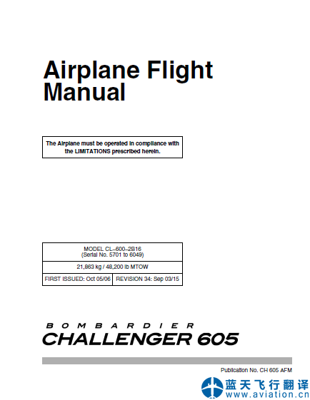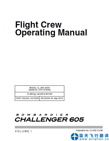 北京藍天飛行翻譯公司完成公務機公司的第34版龐巴迪挑戰(zhàn)者605全套飛行手冊翻譯任務 REVISION 34: Sep 03/15 Bombardier Challenger 605 Flight Manual Translation 第34版龐巴迪挑戰(zhàn)者605飛機飛行手冊 Bombardier Challenger 605 Airplane Flight Manual