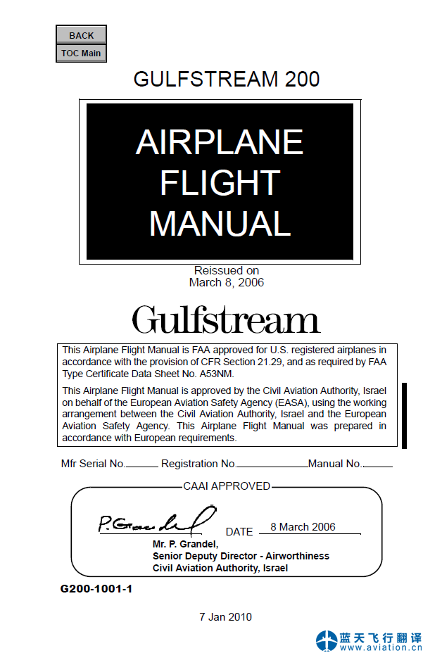 藍天飛行翻譯公司完成公務(wù)機公司的灣流G200飛機飛行手冊和快速檢查單翻譯任務(wù) GULFSTREAM 200 AIRPLANE FLIGHT MANUAL and Quick Reference Handbook Translation ![]() 灣流G200飛機飛行手冊 GULFSTREAM 200 AIRPLANE FLIGHT MANUAL ![]() 灣流G200快速檢查單 GULFSTREAM 200 Quick Reference Handbook 灣流G200飛機飛行手冊(GULFSTREAM 200 AIRPLANE FLIGHT MANUAL)的主要內(nèi)容包含有: G200 AFM Introduction Copyright & License INTRODUCTION GENERAL REVISIONS SUPPLEMENTS DEFINITIONS LIMITATIONS EMERGENCY PROCEDURES ABNORMAL PROCEDURES NORMAL PROCEDURES SUPPLEMENTS COMPATIBILITY LOG OF MODIFICATIONS LOG OF REVISIONS LOG OF TEMPORARY REVISIONS LOG OF EFFECTIVE PAGES Limitations LIST OF FIGURES CERTIFICATE LIMITATIONS KINDS OF OPERATIONS REDUCED VERTICAL SEPARATION MINIMUMS (RVSM) MINIMUM FLIGHT CREW WEIGHT LIMITATIONS MAXIMUM CERTIFICATED WEIGHTS (LB/KG) MINIMUM FLIGHT WEIGHT (LB/KG) BAGGAGE COMPARTMENT WEIGHT AND LOADING CENTER-OF-GRAVITY LIMITATIONS Center-of-Gravity Envelope POWERPLANT LIMITATIONS APPROVED OILS APPROVED FUELS FUEL SYSTEM LIMITATIONS FUEL TANKS CAPACITY FUEL TANK TEMPERATURE LIMITATIONS (indicated) FUEL UNBALANCE MINIMUM FUEL FOR GO-AROUND Maximum Fuel Tank Temperature Vs. Altitude ENGINE OPERATING LIMITATIONS MAXIMUM RPM, N1 AND N2 MAXIMUM INTERSTAGE TURBINE TEMPERATURE TIME LIMITS OIL PRESSURE (At Normal Operating Temperature) OIL TEMPERATURE AMBIENT TEMPERATURE AND ALTITUDE ENVELOPE APU LIMITATIONS APU Load Limits without Mod 10163 SPEED LIMITATIONS MAXIMUM OPERATION LIMIT SPEED (VMO/MMO) MANEUVERING SPEED (VA) Speed Limitations MAXIMUM SLATS/KRUEGER/FLAPS EXTENSION (VSE/VFE) MAXIMUM LANDING GEAR EXTENSION (VLO/VLE) MAXIMUM LANDING GEAR EXTENDED ALTITUDE MAXIMUM TIRE GROUND SPEED MINIMUM CONTROL SPEED - AIR (VMCA) MINIMUM CONTROL SPEED - GROUND (VMCG) MAXIMUM AIR BRAKES OPERATION/ EXTENDED SPEED MINIMUM FLIGHT SPEED MAXIMUM WINDSHIELD WIPER OPERATING SPEED (PRE-MOD 10141) PROHIBITED MANEUVERS LOAD FACTOR LIMITS MAXIMUM APPROVED OPERATING ALTITUDE OPERATING TEMPERATURE/ALTITUDE LIMITATIONS OPERATING TEMPERATURE/ALTITUDE LIMITATIONS RUNWAY SLOPE LIMITATIONS (TAKE-OFF ONLY) MAXIMUM TAILWIND COMPONENTS APPROVED RUNWAY SURFACE TYPE HYDRAULIC SYSTEM LIMITATIONS APPROVED HYDRAULIC FLUIDS HYDRAULIC PRESSURE LIMITATIONS HYDRAULIC TEMPERATURE LIMITATIONS THRUST REVERSERS CABIN PRESSURIZATION MAXIMUM CABIN DIFFERENTIAL PRESSURE ANTI-ICE SYSTEM LIMITATIONS GROUND OPERATIONS DE-ICE SYSTEM LIMITATIONS ELECTRICAL SYSTEM LIMITATIONS DC STARTER - GENERATOR LIMITS BATTERY LIMITS HORIZONTAL STABILIZER TRIM OPERATING LIMITATIONS AUTOPILOT LIMITATIONS Yaw Damper ENHANCED SURVEILLANCE FLIGHT IDENTIFICATION (WITH MOD 10154) INSTRUMENT MARKINGS PLACARDS (Pre MOD 03842) PLACARDS (Post MOD 03842) Emergency Procedures LIST OF FIGURES EICAS WARNING MESSAGES EICAS Display - Primary Page GENERAL GUIDANCE Warning Messages ENGINE FIRE OR ENGINE OVER HEAT |