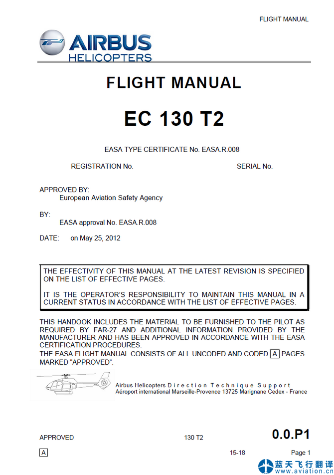 藍(lán)天飛行翻譯公司完成通用航空公司的空客EC130 T2飛行手冊(cè)翻譯任務(wù) AIRBUS HELICOPTERS EC 130 T2 FLIGHT MANUAL Translation