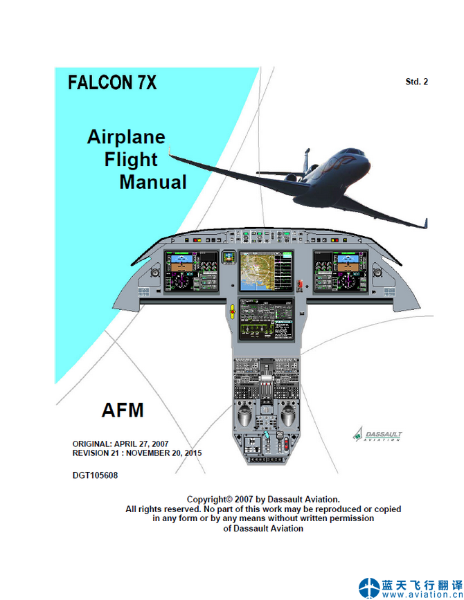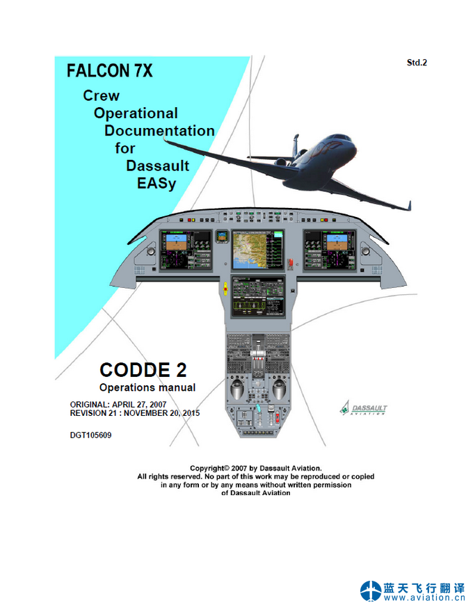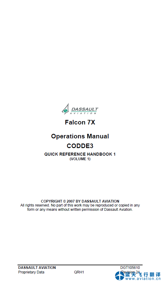 藍(lán)天飛行翻譯公司完成公務(wù)機(jī)公司的達(dá)索7X公務(wù)機(jī)飛機(jī)飛行手冊、機(jī)組操作手冊和快速檢查單等全套達(dá)索7X飛行手冊翻譯任務(wù) FALCON 7X AFM(Airplane Flight Manual), CODDE (Crew Operational Documentation for Dassault EASy) and QRH(QUICK REFERENCE HANDBOOK) Translation