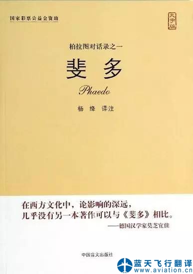 “我按照自己翻譯的習(xí)慣,一句句死盯著原文譯,力求通達流暢,盡量避免哲學(xué)術(shù)語,努力把這篇盛稱語言生動如戲劇的對話譯成戲劇似的對話。柏拉圖的這篇絕妙好辭,我譯前已讀過多遍,蘇格拉底就義前的從容不懼,同門徒侃侃討論生死問題的情景,深深打動了我,他那靈魂不滅的信念,對真、善、美、公正等道德觀念的追求,給我以孤單單生活下去的勇氣。” 2000年,中譯本《斐多》出版,被稱為“迄今為止最感人至深的哲學(xué)譯本”。 楊絳先生談翻譯