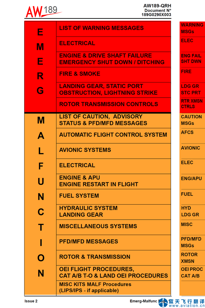 北京藍(lán)天飛行翻譯公司承接直升機(jī)公司AW189直升機(jī)快速檢查單翻譯任務(wù) AW189 Quick Reference Handbook(QRH) Translation