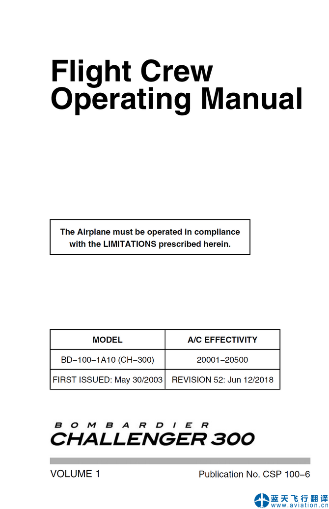 北京藍(lán)天飛行翻譯公司承接公務(wù)機(jī)公司2018年6月12日第52版龐巴迪挑戰(zhàn)者300公務(wù)機(jī)全套飛行手冊翻譯任務(wù) REVISION 52: Jun 12/2018 Bombardier Challenger 300 Flight Crew Operating Manual, Airplane Flight Manual and Quick Reference Handbook Translation