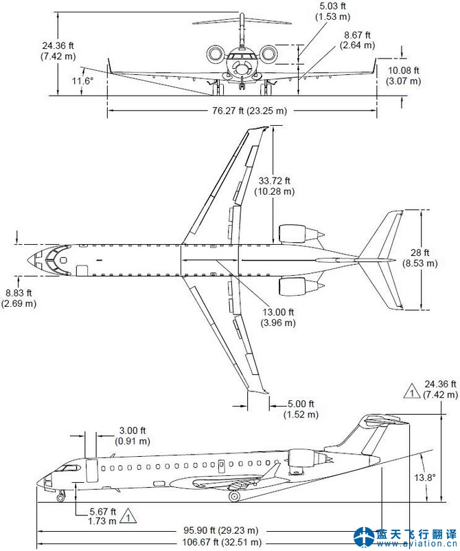 ![]() CRJ700飛機(jī)尺寸 ![]() CRJ700 快速檢查單 CRJ700 QUICK REFERENCE HANDBOOK ![]() CRJ700 快速檢查單 CRJ700 QUICK REFERENCE HANDBOOK CRJ700飛機(jī)是CRJ200飛機(jī)的加長(zhǎng)型,兩者在機(jī)體結(jié)構(gòu)和操縱使用方面具有很高的通用性。與CRJ200相比,CRJ700的主要特點(diǎn)是:通過在CRJ200中機(jī)身的前、后方加入艙段,增大了 機(jī)身和客艙長(zhǎng)度;通過在機(jī)翼根部增加插入段,增大了翼展;換裝了推力更大的新型發(fā)動(dòng)機(jī);每客千米的直接使用成本降低了20%。該機(jī)的維修間隔時(shí)間設(shè)計(jì)為A檢400h,C檢4000h。采用帶有翼翹的后掠式下單翼;后部機(jī)身靠上安裝兩臺(tái)通用電氣CF34渦輪風(fēng)扇發(fā)動(dòng)機(jī);具有后掠式T型垂直尾翼和水平尾翼。其機(jī)翼前緣前伸,并加裝了前緣縫翼。主起落架結(jié)構(gòu)也進(jìn)行了加強(qiáng),采用新的輪胎和剎車系統(tǒng),設(shè)計(jì)壽命提高。 除特別指明外,以下描述均針對(duì)CRJ701與CRJ200的不同之處。 機(jī)身 前機(jī)身加長(zhǎng)3.96m,后機(jī)身加長(zhǎng)0.76m。 機(jī)翼 翼展增加1.83m。機(jī)翼前緣前伸,并加裝了前緣縫翼。 尾翼 尾翼增大了平尾面積。 起落架 液壓收放的前三點(diǎn)起落架,均為雙輪,由美國(guó)古德里奇公司提供。設(shè)計(jì)壽命提高到80000次起降。主起落架支柱延長(zhǎng),采用新的機(jī)輪、輪胎和剎車裝置,其中輪胎壽命提高到250~400次著陸 ,剎車片壽命提高到1600次著陸剎車。主輪輪胎規(guī)格36×12.0-18,胎壓10.55×105Pa。前輪輪胎規(guī)格20.5×6.75-10,胎壓9.24×105Pa。動(dòng)力裝置 2臺(tái)尾吊安裝的CF34-8C1渦扇發(fā)動(dòng)機(jī),單臺(tái)額定推力為56.4kN(不包括自動(dòng)功率儲(chǔ)備)或61.3kN(包括自動(dòng)功率儲(chǔ)備),可在氣溫30。C,其他條件符合國(guó)際標(biāo)準(zhǔn)大氣的情況下保持推力。CRJ705換裝了CF34-8C5渦扇發(fā)動(dòng)機(jī),單臺(tái)額定推力為58.4kN(不包括自動(dòng)功率儲(chǔ)備)或64.5kN(包括自動(dòng)功率儲(chǔ)備)。CRJ705還可選裝CF34-8C5A1渦扇發(fā)動(dòng)機(jī)。有反推力裝置。全權(quán)數(shù)字電子控制。機(jī)內(nèi)總?cè)加腿萘繛?0989L,有壓力和重力加油口。[5] 駕駛艙與客艙 全增壓機(jī)艙,雙人制駕駛艙。客艙標(biāo)準(zhǔn)布局為70座,每排4座并有中央通道,排距79cm,中央通道寬41cm,高1.89m。客艙地板降低2.5cm,頂板抬高1.3cm,舷窗位置抬高11.5cm。衣櫥、廚房和盥洗室有多種組合方式,具體取決于客艙布局。重新設(shè)計(jì)了頭頂行李柜,并在客艙前部地板下方左側(cè)新設(shè)1個(gè)容 積為3.08m3的行李艙,全機(jī)行李艙容積增加了近10m3。CRJ705的客 艙標(biāo)準(zhǔn)布局為75座,每排4座并有中央通道,爵士航空公司訂購(gòu)的飛機(jī)采用兩級(jí)布局,即公務(wù)艙10座、排距94cm和經(jīng)濟(jì)艙65座、排距87cm。