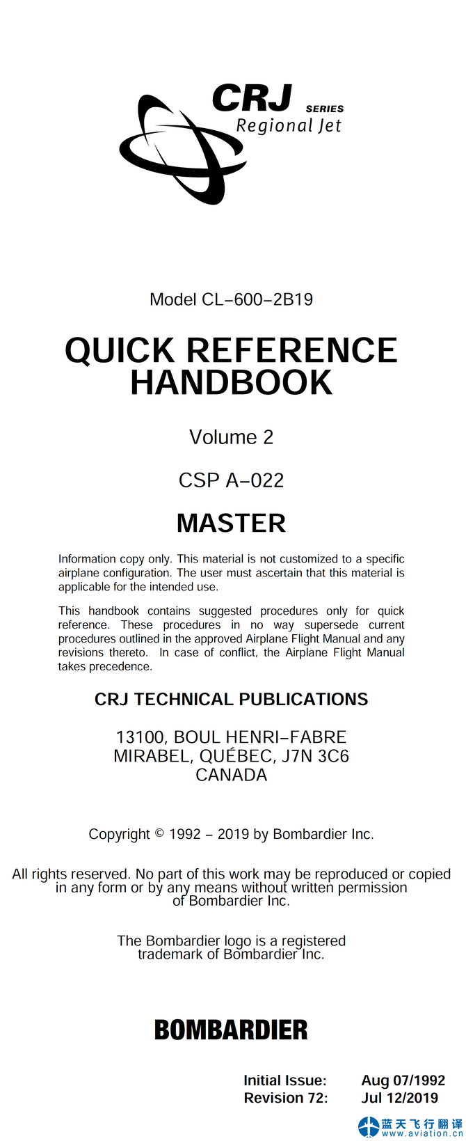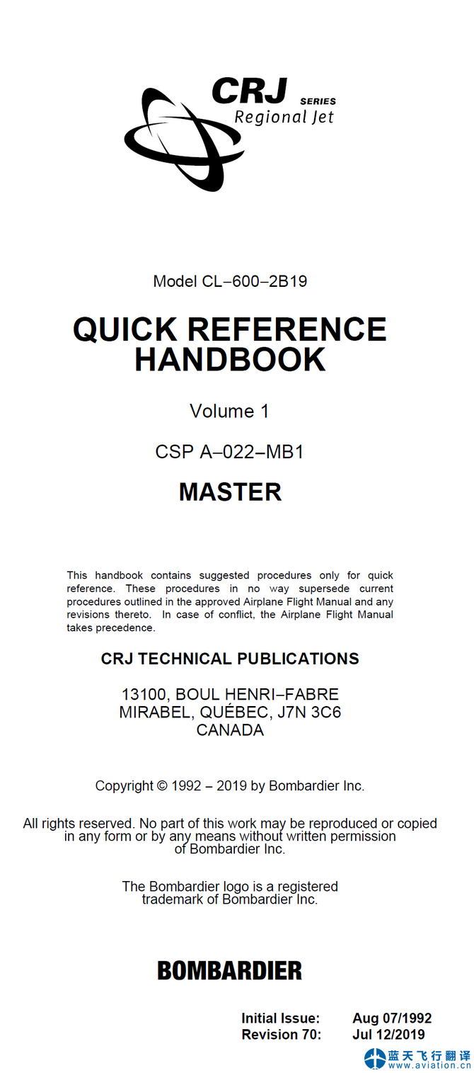 本次翻譯的CRJ200快速檢查單為第70版,2019年7月12日版本,分為上下兩冊(cè)。Model CL−600−2B19