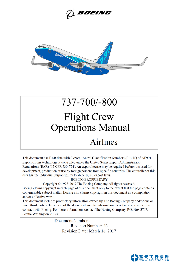 北京藍天飛行翻譯公司本次翻譯的波音737NG飛行機組使用手冊(Flight Crew Operations Manual)版本日期為2017年3月16日,包含157架波音737-700/-800飛機。