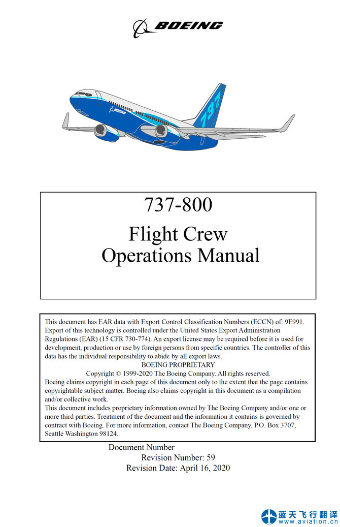 北京藍(lán)天飛行翻譯公司本次翻譯的737-800飛行機(jī)組使用手冊(cè)、快速檢查單和飛機(jī)飛行手冊(cè)修訂日期為2020年4月16日,總共包含62架飛機(jī)。