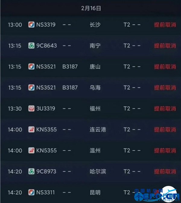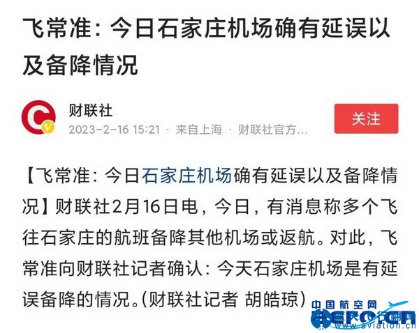 2月16日,有消息稱中午前后多個飛往石家莊的航班備降其他機場或返航。有網(wǎng)友稱是大霧原因,還有網(wǎng)友稱石家莊上空全部都是軍機。